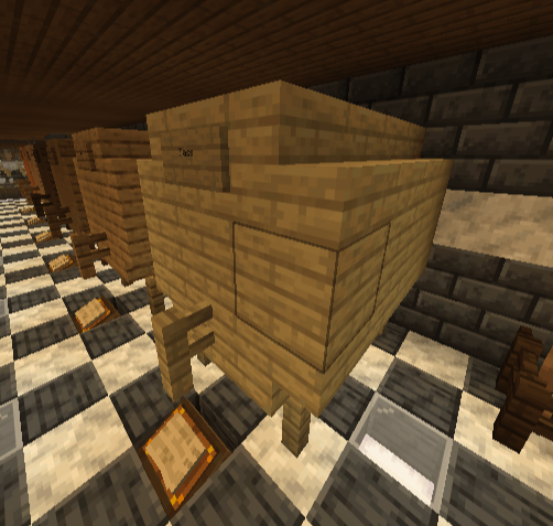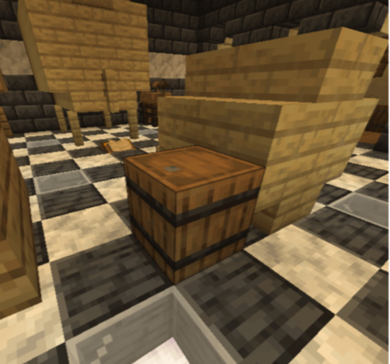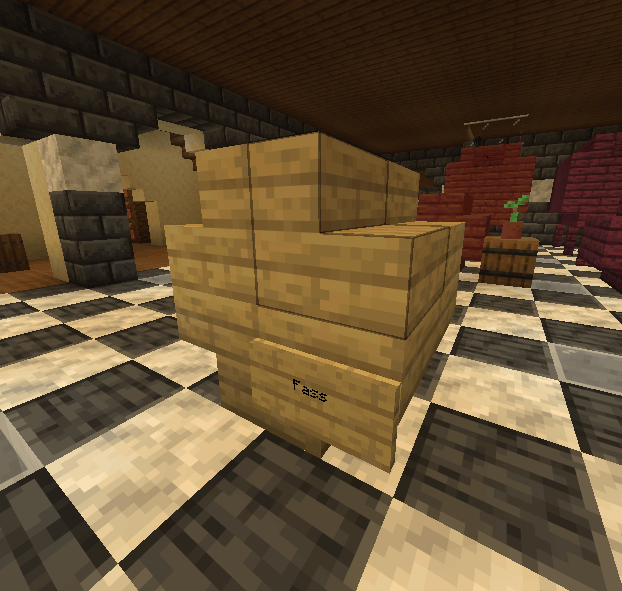 4 Zäune, 16 Holztreppen, 18 Holzplanken wie oben gezeigt anordnen. (innen hohl) Bringe nun an der Vorderseite unten, mittig, ein Zaun an (Zapfhahn). Bringe oben, mittig ein Schild an, beschrifte es mit: Fass